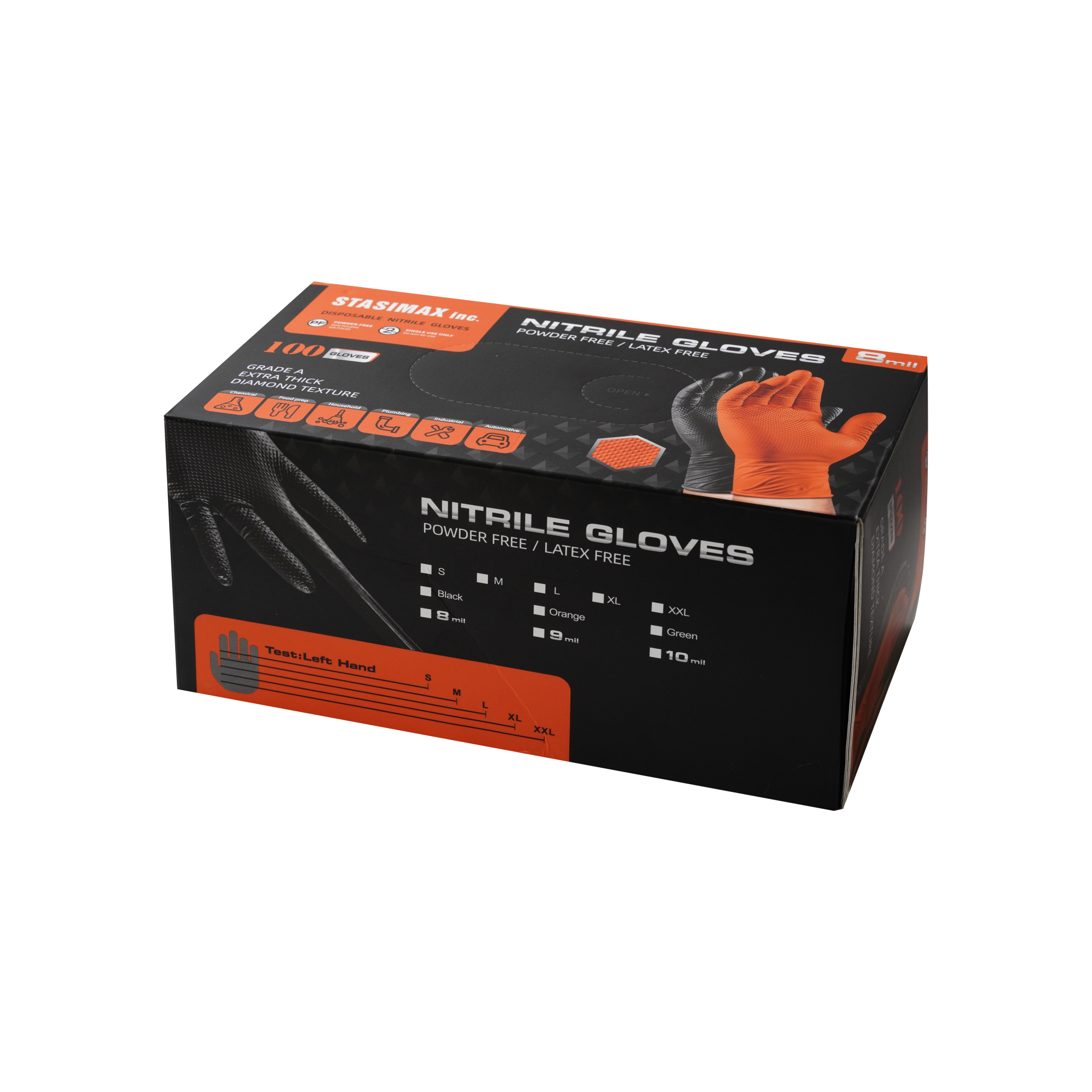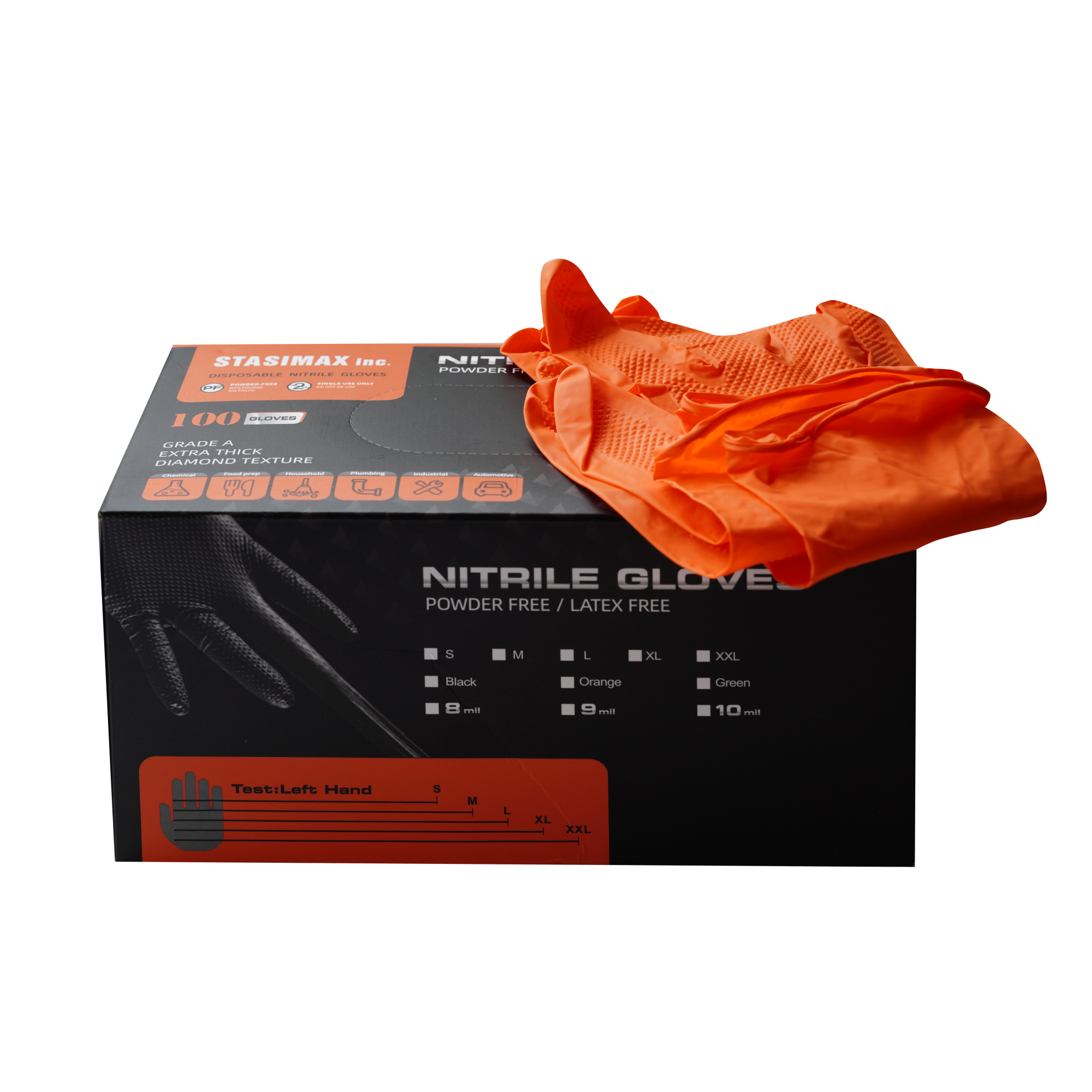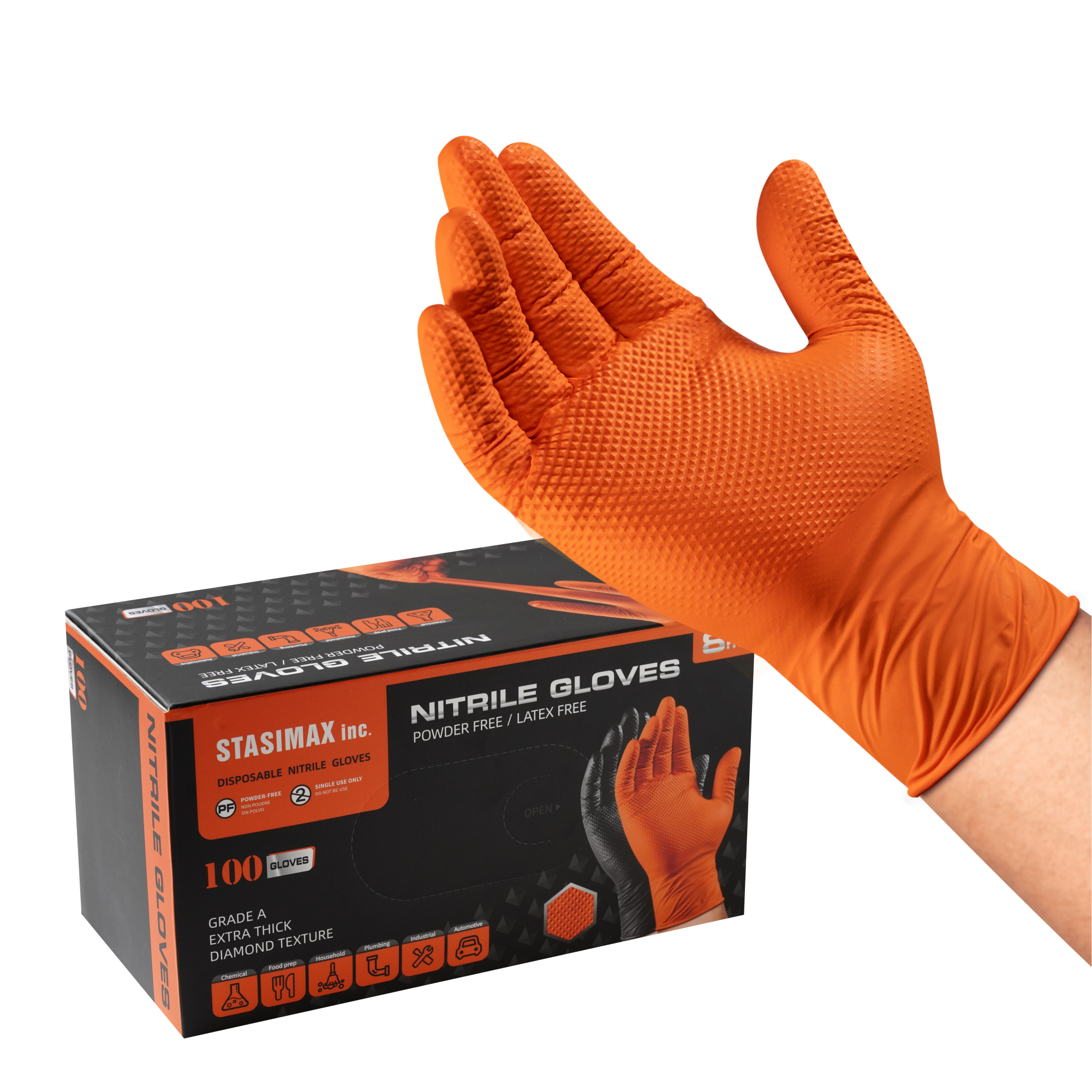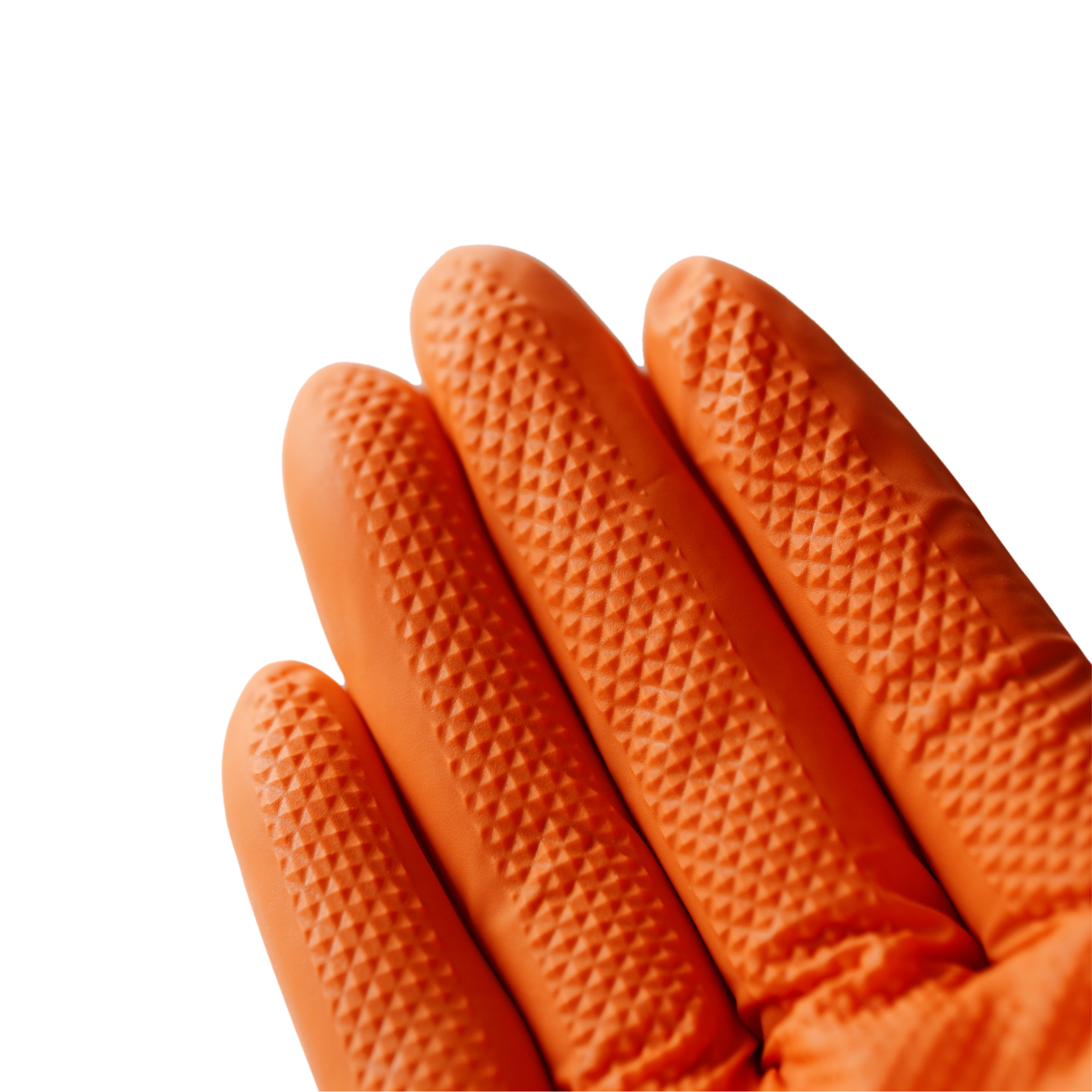 Our Orange Nitrile Diamond Textured Heavy Duty Gloves (8mil) are designed for superior durability, grip, and protection. Made from premium nitrile, these gloves are stronger and more puncture-resistant than standard latex or vinyl gloves, making them ideal for tough jobs. The diamond-textured surface enhances grip in both wet and dry conditions, ensuring precision and control. Their bright orange color improves visibility and safety in the workplace, while the 8mil thickness provides excellent resistance against tears, chemicals, and abrasions. Perfect for mechanics, industrial workers, cleaning professionals, and heavy-duty tasks where strength and reliability are essential.
